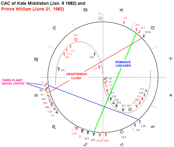 First of all: They were highly attracted to each other because they formed both Sexual Linkages and also Romance Linkages. In fact, Middleton and Prince William form a Three-Planet Sexual Vortex and also a Romantic Super Linkage.