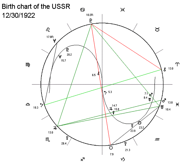 The astrology of nations is a part of a special astrology called MUNDANE ASTROLOGY. With the correct chart, we now fully fathom why the USSR was the way it was. Below is the birth chart of the USSR.