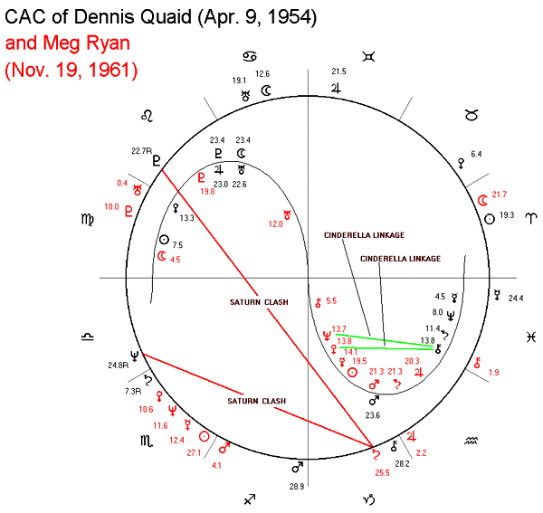 I: According to Magi Astrology, in most cases, in order for two persons to fall in love and get married, they need to form Cinderella Linkages. Meg Ryan and Dennis Quaid formed two Cinderella Linkages.