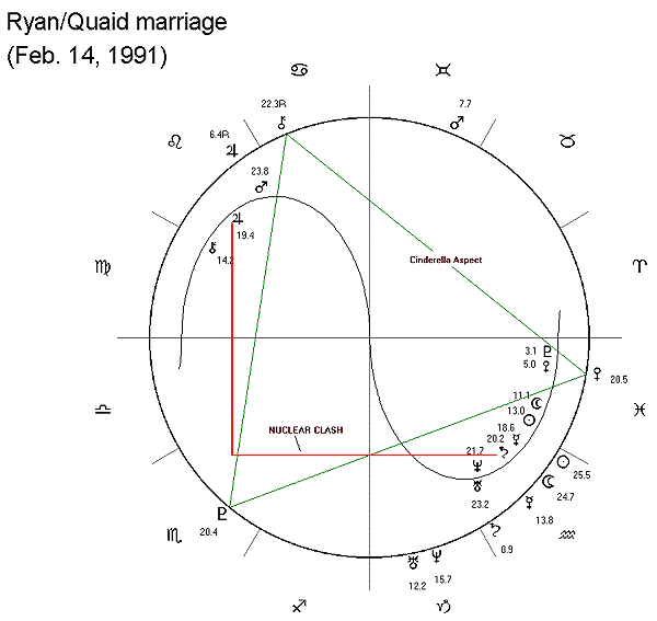 V: According to Magi Astrology, every marriage has a birth chart and the birth chart of the marriage is the chart of the day of the wedding. In addition, the strengths and weaknesses of the Planetary Geometry of the Marriage Chart have highly significant influences on the characteristics and ultimate outcome of the marriage. Certain astrological aspects in a Marriage Chart are very helpful to the marriage as well as the career success of the married couple; whereas other astrological aspects are destructive of the marriage and the couple's careers. The best aspects to have are the Cinderella Aspects. But the worst aspects are the Heartbreak Clash (a Turbulent Angle formed between Saturn and Chiron) and the Nuclear Clash (a Turbulent Angle formed between Saturn and Jupiter). When Ryan married Quaid, there was a Nuclear Clash in the sky and this is one of the reasons the marriage ended so sadly.